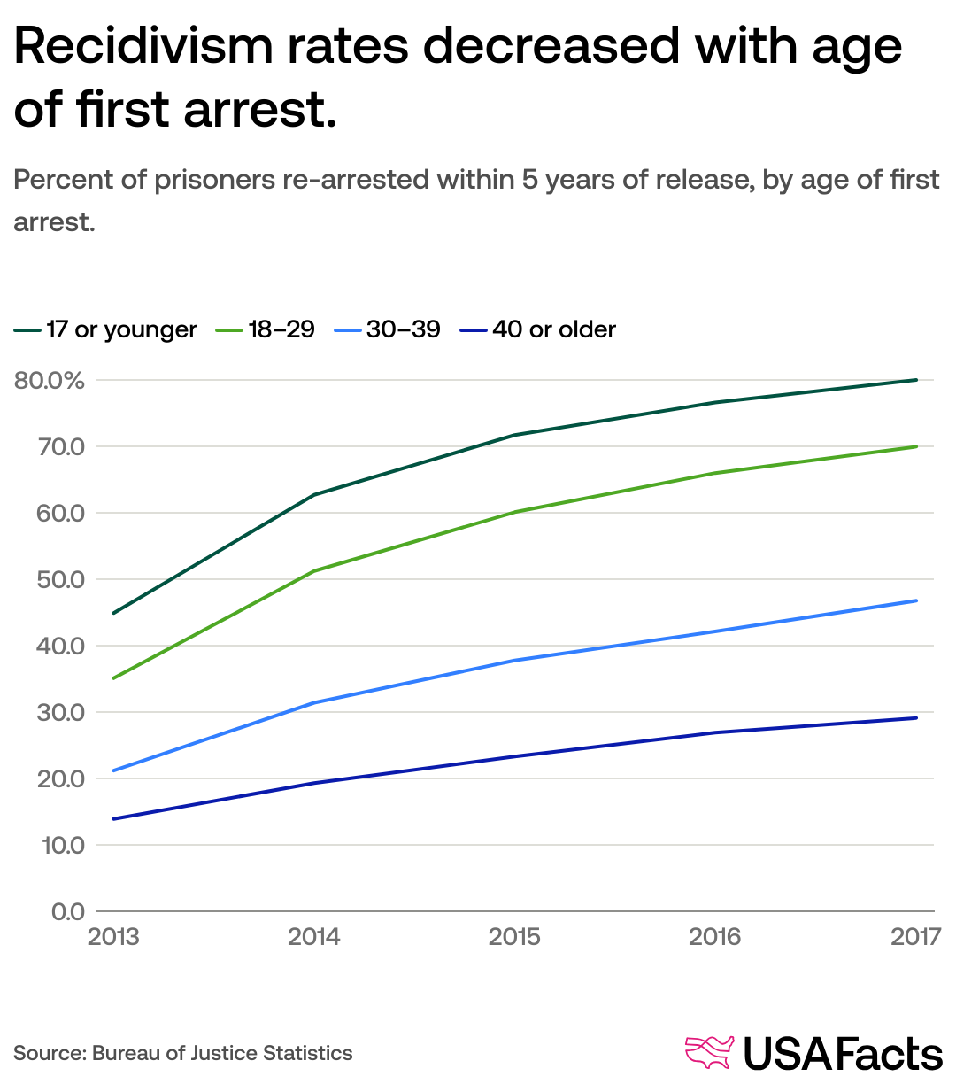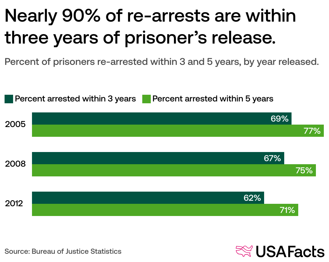 Seventy percent of prisoners released in 2012 were arrested again within five years, according to data from the Bureau of Justice Statistics (BJS). The recidivism rate is over 80% for prisoners with juvenile records.